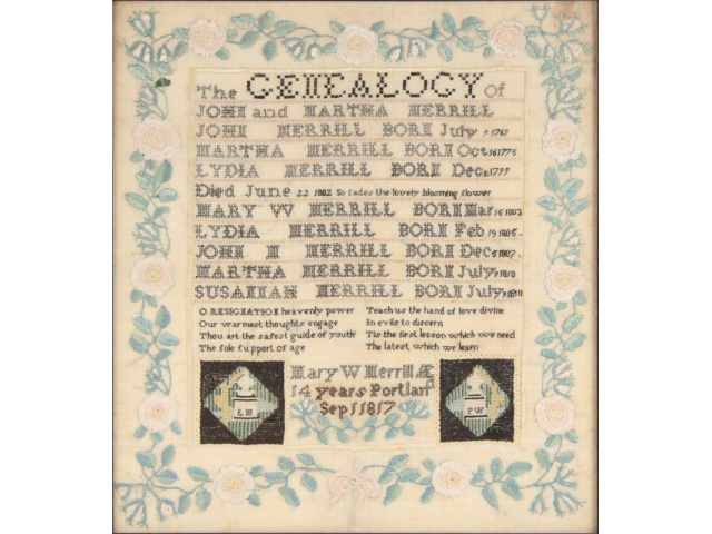 In the needlework, ceramics, pewter and decorative arts categories, collectors will appreciate the sale's needlework samplers and early American embroidery, crafted by schoolgirls from Nantucket to Maine to Philadelphia, each demonstrating the artistry, diligence, and educational values of young women in the 18th and 19th centuries.